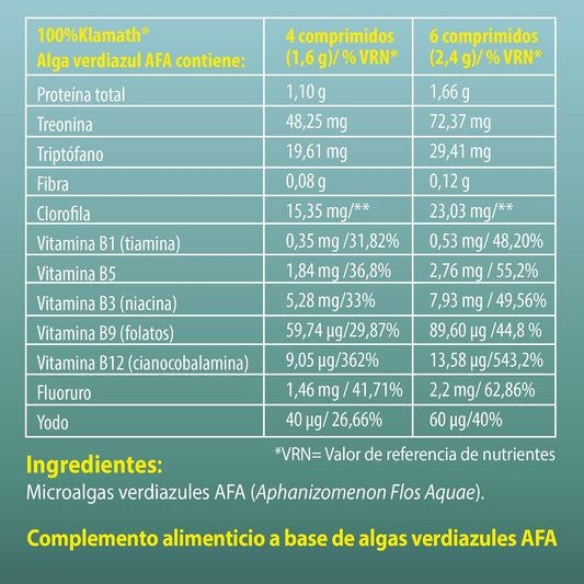 100% KLAMATH® -ALGAS VERDIAZULES AFA Bote con 180 Comprimidos.