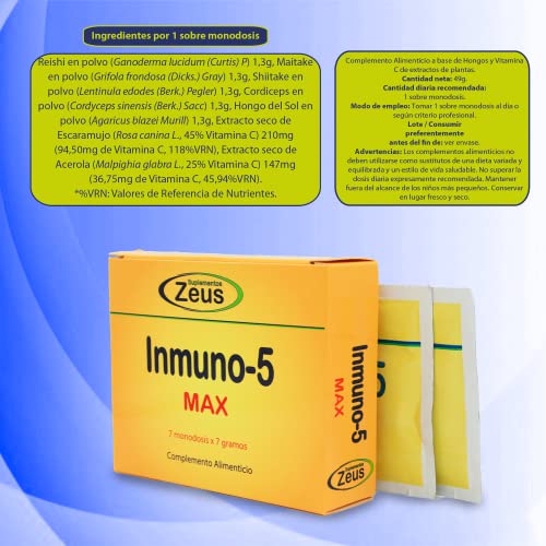 INMUNO-5 MAX | Contribuye al funcionamiento normal del sistema inmunitario |Complemento Alimenticio a base de Hongos y Plantas que aportan Vitamina C |100% Vegano|7 Sobres
