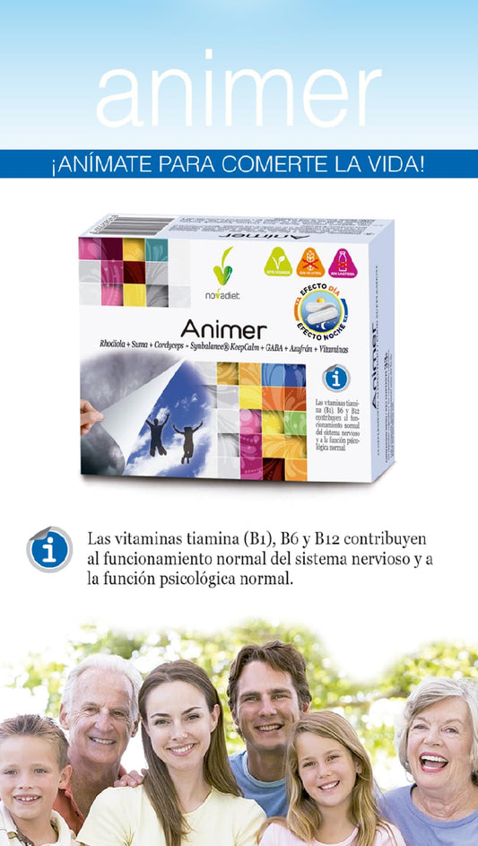Novadiet – ANIMER Cápsulas con Rodiola, Suma, Cordyceps, Symbalance, KeepCalm, GABA, Azafrán y Vitaminas - Mejora el Estado de Ánimo, Reduce la Fatiga Física y Mental - 60 Cápsulas Vegetales