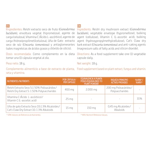 Nature Essential | Reishi 2.000 mg | Suplemento Alimenticio con Uña de Gato y Vitamina C | Favorece las Defensas | 30 Cápsulas Vegetales