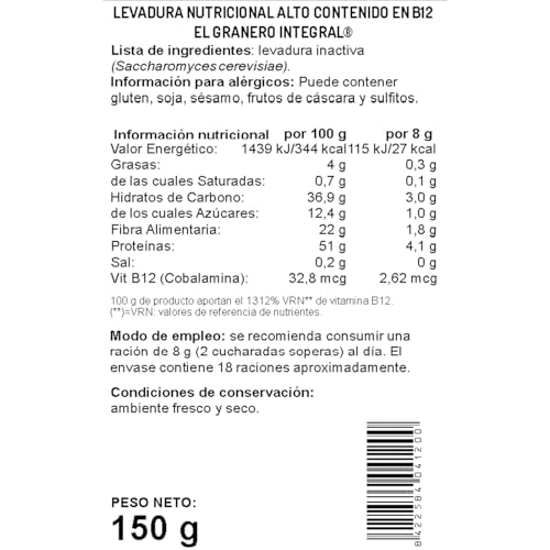 El Granero Integral - Levadura Nutricional - 150 g - Alto Contenido en Vitamina B12 - Contribuye al Metabolismo Energético Normal - Excelente Fuente de Proteínas - Apto para Consumo Vegano