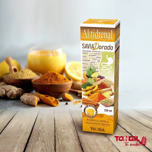 Tongil - Aktidrenal Savia Dorada 250ml - Cúrcuma, Hinojo, Canela, Chlorella, Aloe Vera, Frutas, Verduras, Enzimas, vitaminas y Minerales - Detoxifica y Favorece el Confort Digestivo - Apto Veganos