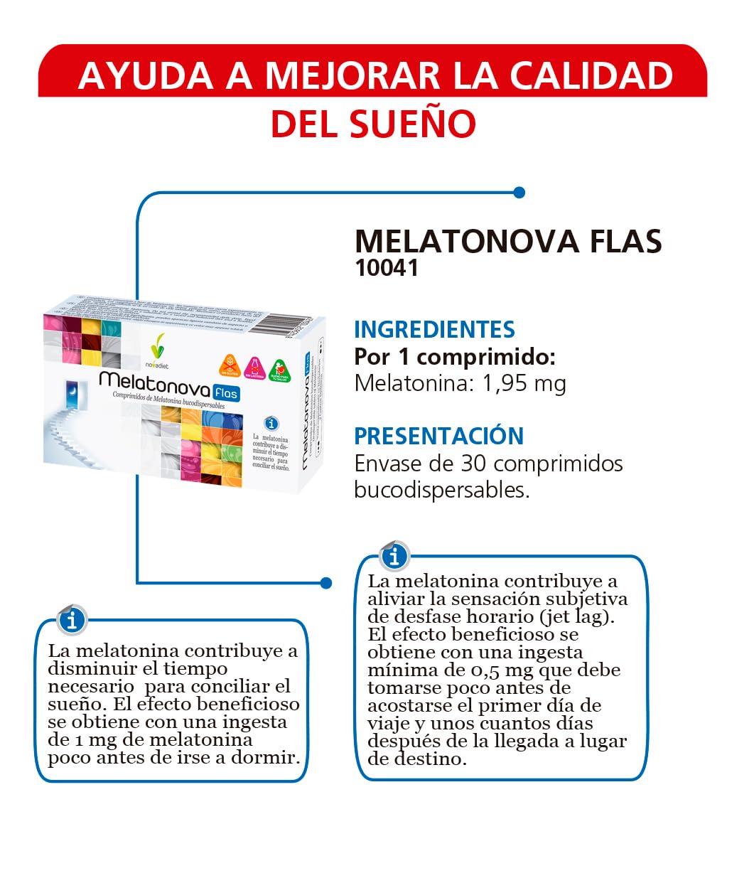 - ALIVIA EL JET LAG: Gracias a su fórmula con MELATONINA, MELATONOVA FLAS alivia los efectos del desfase horario, ayudándote a adaptarte más rápidamente a los nuevos horarios.