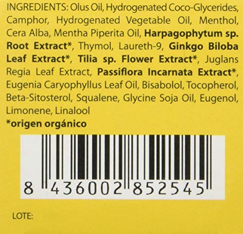 Detalles: Descripción Rhatma forte es un ungüento balsámico compuesto por una alta concentración de principios activos vegetales. Efecto balsámico y relax inmediato para la pesadez y tensiones musculares. Propiedades descongestionantes y relajantes de los músculos. Composición de Rhatma forte: Extracto de Cinnamomum camphora (alcanfor): Estimula la circulación sanguínea, reduce el hematoma y eleva la temperatura local. Extracto de Mentha piperita (mentol): Actúa sobre los centros nerviosos, relajándolos. Estos dejan de transmitir los impulsos dolorosos. Extracto de Caryofilus áromaticus (clavo): Especie aromática rica en taninos. Gran contenido en aceite esencial, de efectos calmantes y ligeramente desinfectante. Extracto de Ginko biloba: Con una intensa acción sobre el comportamiento anormal de la circulación sanguínea, aumentando la tonicidad de las venas y disminuyendo la permeabilidad capilar. Extracto de Harpagophytum procumbens: Une a una eficaz acción antiinflamatoria, la de disminuir el dolor, especialmente en casos de dolor semicrónicos o crónicos. Extracto de Capsicum anuun: Planta con diferentes variedades en oriente: Japón, Bombay, etc.; todas contienen capsicina, muy eficaz contra lumbalgias y reumatismos. Modo de empleo Aplicado con un ligero masaje sobre las partes afectadas por el dolor, produce un alivio inmediato, sea éste de origen reumático o artrósico. Es asimismo muy eficaz en los dolores de origen traumático: golpes, torceduras, tortícolis, hinchazón por contusiones, inflamaciones, también en las producidas por picaduras de insectos, etc.