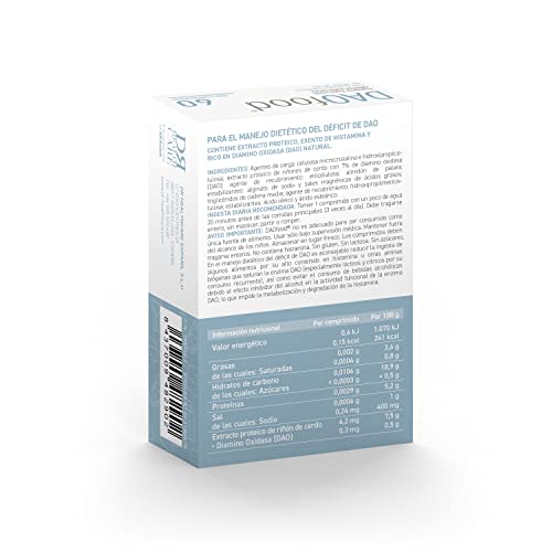 Detalles: Descripción Descripción del producto Alimento para usos médicos especiales para el manejo dietético del Déficit de DAO (DiAminoOxidasa) cuando los síntomas causados por la acumulación de histamina alimentaria son predominantemente digestivos, tales como estreñimiento, diarrea, hinchazón, digestión pesada, acidez o síndromes de intestino irritable y de colon irritable. En el tratamiento dietético del Déficit de DAO es aconsejable reducir la ingesta de algunos alimentos por su alto contenido en histamina u otras aminas biógenas que saturan la enzima DAO, entre los que destacan especialmente por su habitual consumo recurrente la leche de vaca, los productos derivados lácteos y los cítricos. Ingredientes Agentes de carga: celulosa microcristalina e hidroxipropilcelulosa; extracto de proteína de riñón de cerdo con un 7% de diamino oxidasa (dao); agente de recubrimiento: etilcelulosa; almidón de patata; estabilizantes: alginato de sodio y estearato de magnesio; triglicéridos de cadena media; agente de recubrimiento: hidroxipropilmetilcelulosa; estabilizantes: ácido oleico y ácido esteárico. dirección Tome un comprimido con un poco de agua 20 minutos antes de las principales comidas (3 veces al día). Los comprimidos de DAOfood presentan un recubrimiento gastrorresistente que permite que la enzima DiAmino oxidasa no se libere en el estómago, sino de forma retardada en el intestino delgado, que es donde degrada la histamina ingerida en dieta. Por ello los comprimidos deben tomarse enteros, sin masticar ni partir o romper antes de su ingesta. Advertencia de seguridad DAOfood no sustituye a una alimentación equilibrada y una forma de vida sana, ni sirve como fuente de alimentación única. El alcohol y los medicamentos pueden inhibir en gran medida la acción de la enzima DiAminoOxidasa (DAO).Ver la fecha de consumo preferente en el packaging. Usar sólo bajo supervisión de un médico o nutricionista, quien recomendará la dosificación en base a los síntomas. Mantener fuera del alcance de los niños. Almacenar en lugar fresco. Aviso legal DAOfood no es adecuado para ser consumido como única fuente de alimento. Mantener fuera del alcande de los niños. Almacenar en lugar fresco y seco.