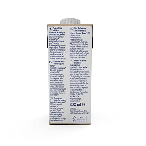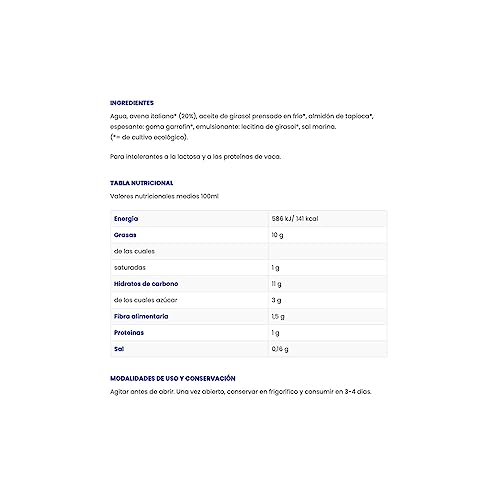 - INGREDIENTES NATURALES: Elaboramos esta deliciosa crema para cocinar a base de agua, avena, aceite de girasol de primera presión en frío, almidón de tapioca, espesante y emulsionante. Este producto es 100% orgánico y apto para consumo vegano.