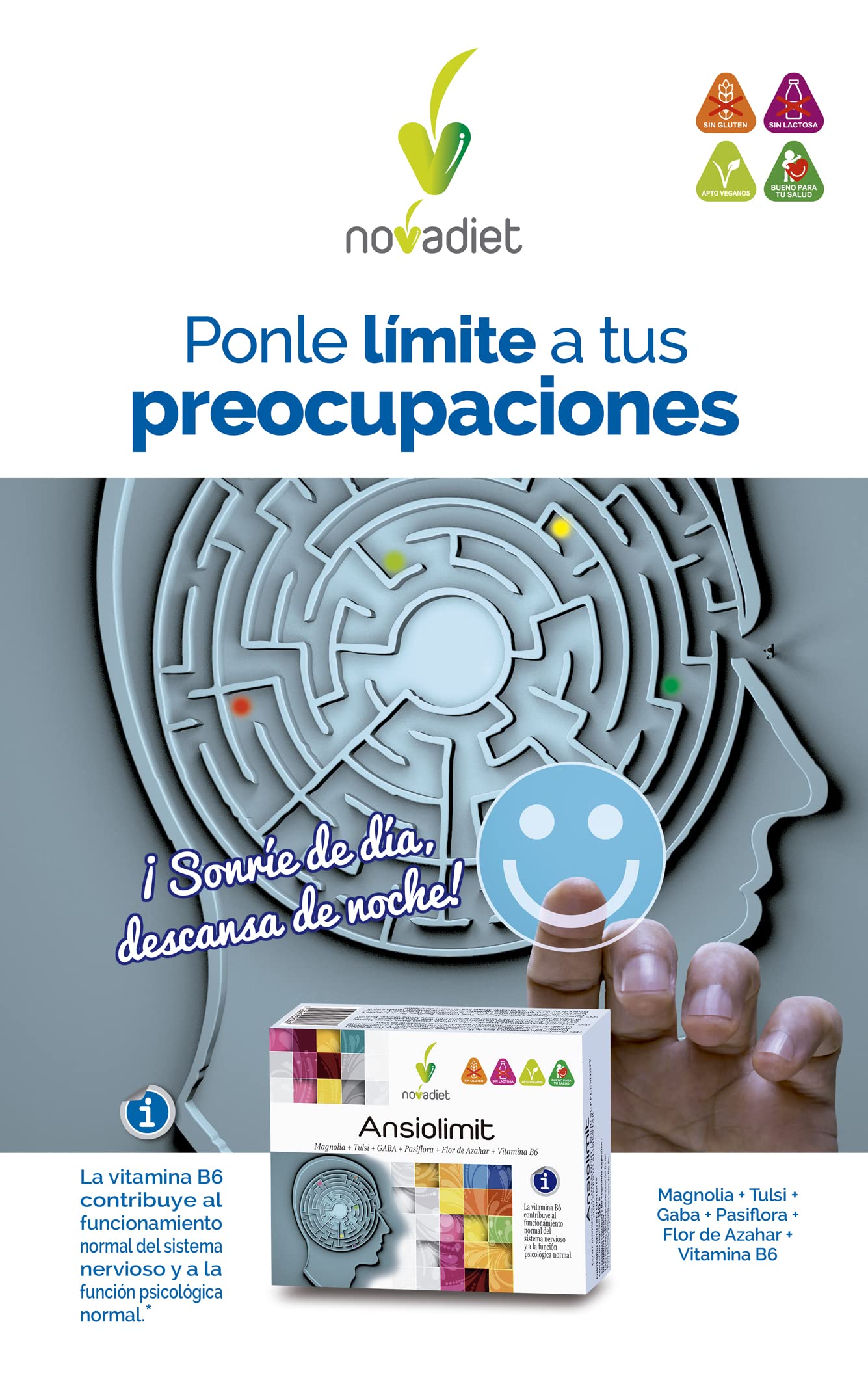Novadiet - ANSIOLIMIT Cápsulas con Vitamina B6, Magnolia, Tulsi, GABA, Pasiflora, Flor de Azahar, Vitamina B6, Ayuda a Disminuir la Ansiedad, Agobio, Estrés y el Nerviosismo - 60 Cápsulas