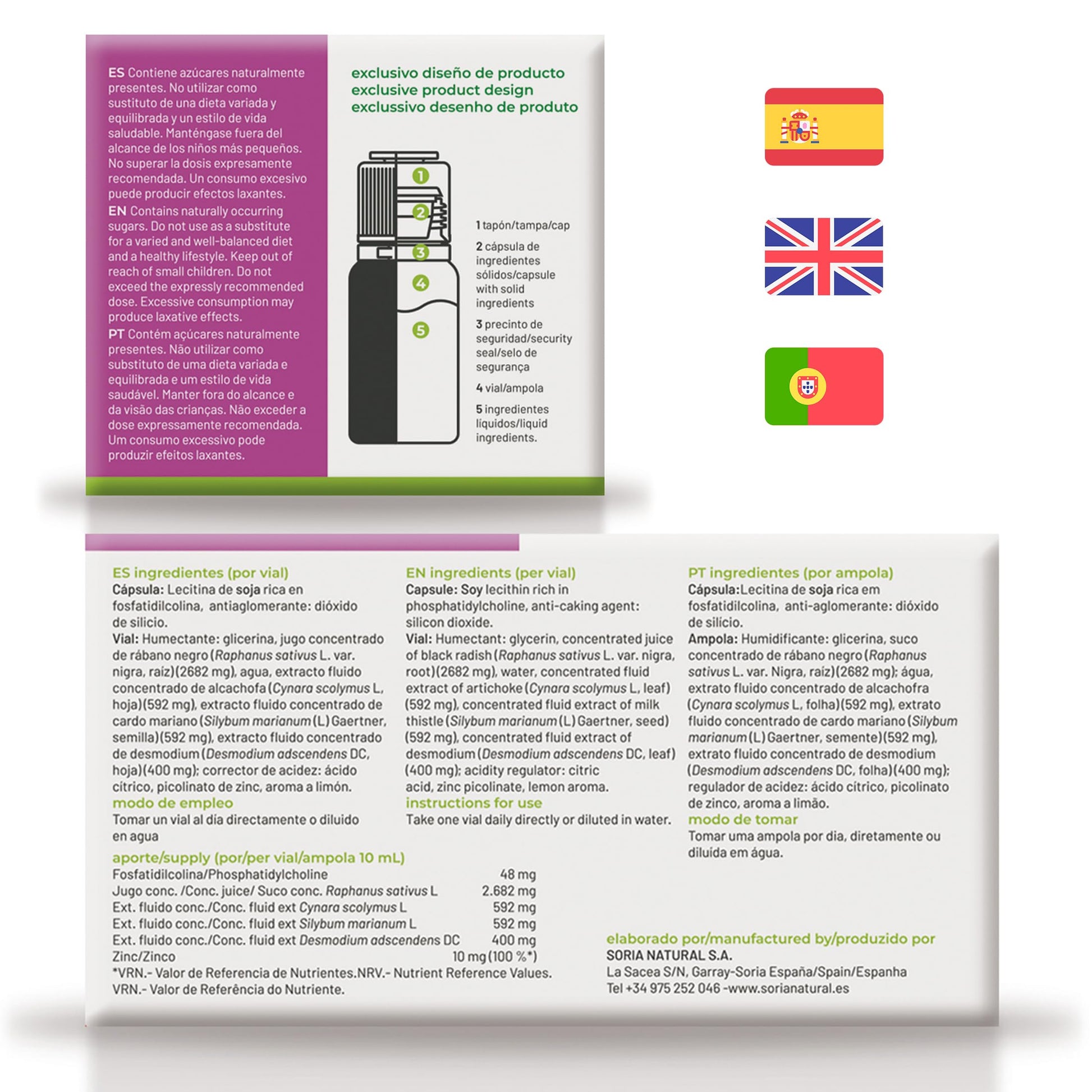 - 🍀 Formulado con jugo concentrado de rábano negro y extractos fluidos concentrados de alcachofa, cardo mariano, ingrediente que ayuda a la salud hepática, zinc, contribuye a la protección de las células y al metabolismo normal de los ácidos grasos, y lecitina de soja, ideal para reducir el colesterol en sangre