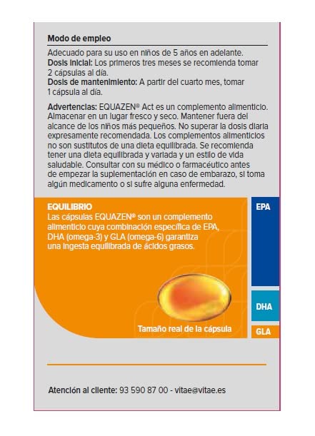 Vitae Equazen Act 60 cápsulas | Fórmula única de Omega 3 y 6 | Alto poder nutricional (EPA, DHA y GLA) | Atención, concentración, memoria y rendimiento