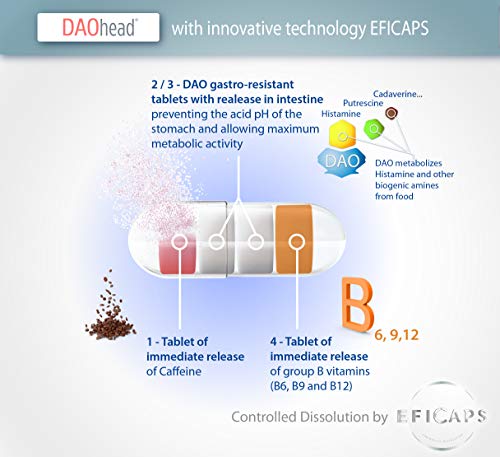 DAOhead – Manejo de la Migraña Causada por déficit de DAO/Intolerancia a la histamina - 60 Cápsulas EFICAPS con Comprimidos Gastrorresistentes – Enzima DAO, Vitamina B6, B9, B12 y Cafeína