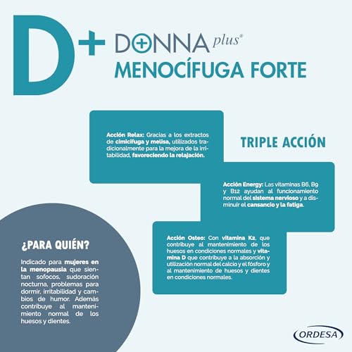 Detalles: Descripción del producto DONNAplus Menocífuga Forte es un complemento alimenticio para mujeres en edad de menopausia a base de cimicífuga racemosa, melisa y vitaminas K12, D3, B6,B9 Y B12. ¿CÓMO TE AYUDA? Con la llegada de la menopausia, pueden aparecer molestias como los sofocos, sudoración nocturna, problemas para dormir, irritabilidad y cambios de humor. Este complemento alimenticio de origen vegetal puede ayudarte a paliarlos y hacer esta etapa más llevadera. No solo te ayuda frente a estos cambios, también será un gran aliado ante la reducción de los estrógenos asociada a la menopausia como es la disminución de la densidad ósea, que se incrementa con el paso de los años. ¿CÓMO ACTÚA? Gracias a su completa e innovadora composición te ayudará con su triple efecto: • Acción Relax- Gracias a los extractos de cimicífuga y melisa, utilizados tradicionalmente para la mejora de la irritabilidad, favoreciendo la relajación. • Acción Osteo- La vitamina K2, contribuye al mantenimiento de los huesos en condiciones normales y la vitamina D contribuye a la absorción y utilización normal del calcio y el fósforo y al mantenimiento de huesos y dientes. • Acción Energy- Las vitaminas B6, B9 y B12 te ayudarán al funcionamiento normal del sistema nervioso y a disminuir el cansancio y la fatiga. ¿QUÉ ES? La cimicífuga es una planta de uso tradicional utilizada en caso de sofocos e irritabilidad asociados a la menopausia. La melisa contribuye a disminuir la ansiedad, estrés e irritabilidad. Las vitaminas ayudan al mantenimiento de los huesos y a disminuir el cansancio y la fatiga. FORMATO- 30 comprimidos bicapa- Una capa amarilla de liberación inmediata y una azul de liberación sostenida a lo largo de la noche. Tomar 1 comprimido con un vaso de agua media hora de dormir. *Sin lactosa, sin gluten, sin sacarosa. Ingredientes Agente de carga (Celulosa microcristalina), Extracto seco de hoja de Melisa (Melissa officinalis L. hoja) al 2% en ácido rosmarínico, Vitamina K2, Correcto de acidez (Fosfato dicálcico), Estabilizante (Polivilpirrolidona), Extracto seco de raíz de Cimicífuga 4-9:1 (Cimicifuga racemosa (L.) Nutt., raíz) al 2,5% en glicósidos triterpénicos, Estabilizante (Carboximatilcelulosa sódica), Vitamina D3, Colorante (Óxido de hierro), Antiaglomerante (Dióxido de silicio), Estabilizante (Sales magnésicas de ácidos grasos), Vitamina B6, Ácido fólico, Vitamina B12, Agente de recubrimiento (Hidroxipropilmetil celulosa), Estabilizante (Ácidos grasos), Agente de Carga (Celulosa microcristalina). Advertencia de seguridad Mantener fuera del alcance de los niños más pequeños. No superar la dosis diaria recomendada. Guardar en un lugar fresco y seco.