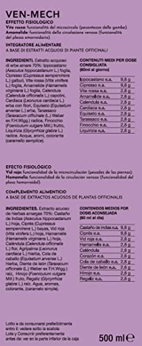 Detalles: Descripción Descripción del producto Decottipirico que favorece la funcionalidad de la microcirculación y con hamamelis que actúa sobre la funcionalidad de la circulación venosa. CUANDO UTILIZARLO Adecuado para aquellos que se quejan de piernas cansadas, piernas hinchadas, hormigueo, celulitis o venas / capilares en evidencia. También es excelente para quienes padecen hemorroides. QUE CONTIENE Extracto acuoso de hierbas amargas 70%: hoja de castaño de indias (Aesculus hippocastanum L.), ciprés (Cupressus sempervirens L.) galbuli, hoja de vid roja (Vitis vinifera L.), hoja de hamamelis (Hamamelis virginiana L.), caléndula (Calendula officinalis L .) cabezas de flores, hierba Cardiaca (Leonurus Cardiac L.) con flores, hierba de cola de caballo (Equisetum arvense L.), diente de león (Taraxacum officinale (L.) Weber ex FHWigg.) raíz, hinojo (Foeniculum vulgare Mill.) fruta, regaliz (Glycyrrhiza glabra L.) raíz. Agua, aromatizantes, colorantes (caramelo simple)." Ingredientes Extracto acuoso de hierbas amargas 70%: hoja de castaño de Indias (Aesculus hippocastanum L.), ciprés (Cupressus sempervirens L.) galbuli, hoja de vid roja (Vitis vinifera L.), hoja de hamamelis (Hamamelis virginiana L.), caléndula (Calendula) officinalis L.) cabezas de flores, Cardiaca (Leonurus cardia L.) hierba con flores, hierba cola de caballo (Equisetum arvense L.), diente de león (Taraxacum offi cinale (L.) Weber ex FHWigg.) raíz, hinojo (Foeniculum vulgare Mill.) fruto, raíz de regaliz (Glycyrrhiza glabra L.). Agua, aromas, colorantes (caramelo natural). dirección Mantener en un lugar seco Advertencia de seguridad Evitar el contacto con llamas o calor directo. Aviso legal No usar durante el embarazo o en casos de hipertensión.