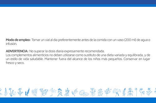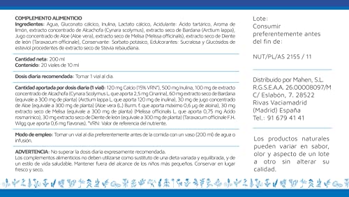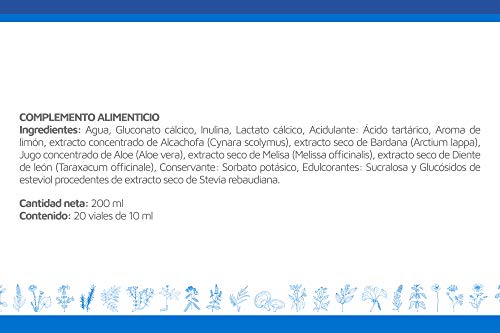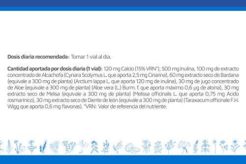 Detalles: Descripción Descripción del producto Contribuye al bienestar del aparato digestivo. Recomendado en caso de dificultades en el aparato digestivo como gases, reflujo, acidez y digestiones lentas. Precauciones: No se han descrito. Composición: Por 1 vial: Inulina.500 mg Bardana. 300 mg Melisa.300 mg Alcachofera .300 mg Diente de León .300 mg Calcio .110 mg Zumo de Aloe Vera. Hasta 10 mg Zumo de Aloe Vera, Inulina, Barbana Extracto Fluido, Melisa Extracto Fluido, Alcachofera Extracto Fluido, Diente de León Extracto Fluido, Cloruro Cálcico, Estevia, Ácido Cítrico, Sorbato potásico y Benzoato sódico. Ingredientes Agua, gluconato cálcico, inulina, lactato cálcico, acidulante: ácido tartárico, aroma de limón, extracto concentrado de alcachofa (Cynara scolymus), extracto seco de bardana (Arctium lappa), jugo concentrado de aloe (Aloe vera), extracto seco de melissa (Melissa officinalis), extracto seco de diente de león (Taraxacum officinale), conservante: sorbato potásico, edulcorantes sucralosa y glucósidos de esteviol procedentes de extracto seco de estevia (Stevia rebaudiana). Advertencia de seguridad Conservar en lugar seco, fresco y no expuesto a la luz solar. Aviso legal No superar la dosis diaria recomendada. Los complementos alimenticios no deben utilizarse como sustitutos de una dieta variada y equilibrada.