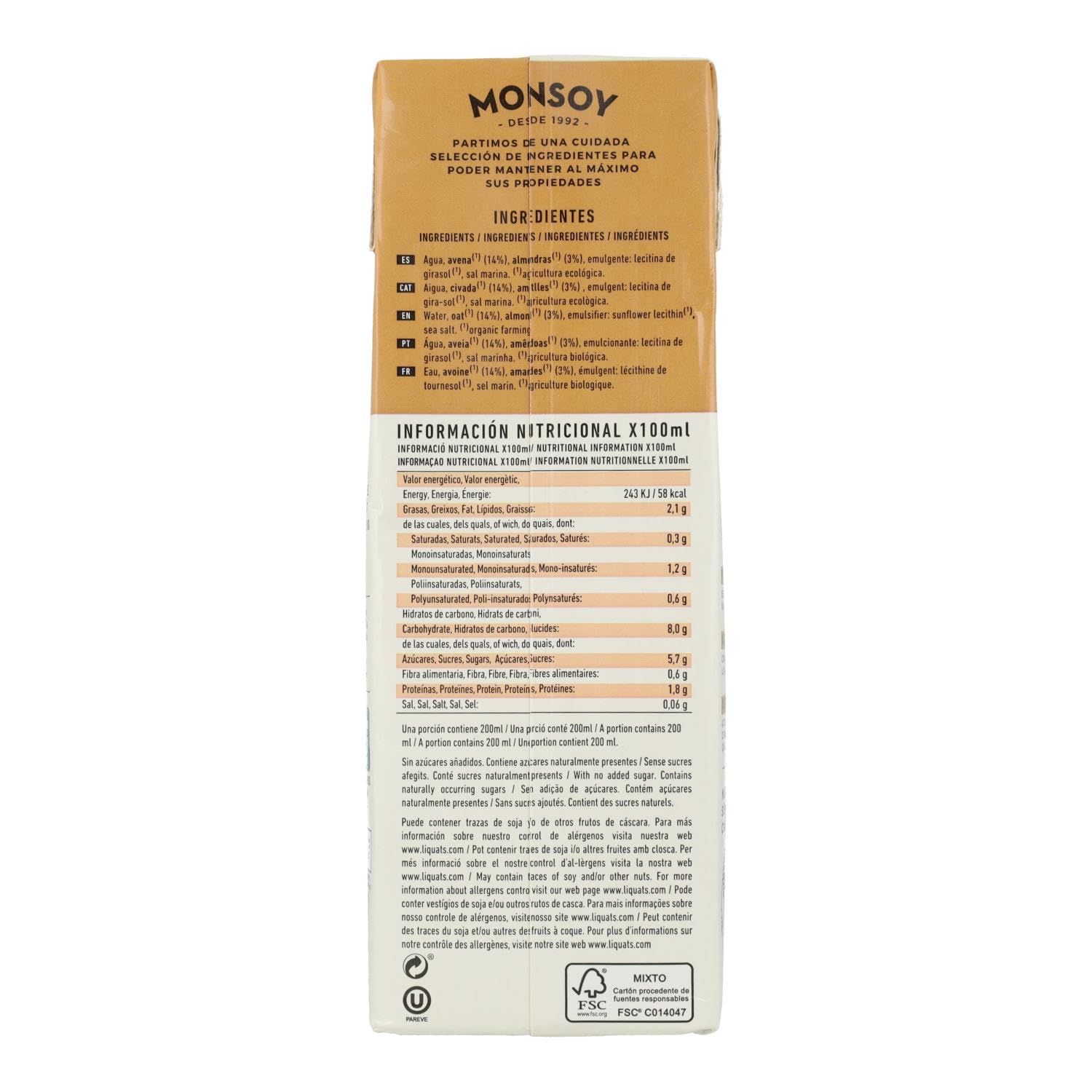 Monsoy Bebida DE Avena+ALMENDRAS Bio 1 L, Estándar, Único