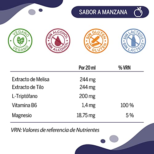 - COMPOSICIÓN: agua purificada, sirope de agave, agente de carga (glicerina), gluconato de magnesio, extractos de plantas (Melissa officinalis L. (melisa) y Tilia cordata Miller (tilo)), L-triptófano, aromatizante (aroma de manzana), acidificante (ácido cítrico), conservante (sorbato potásico), espesante (goma xantana), piridoxina clorhidrato.