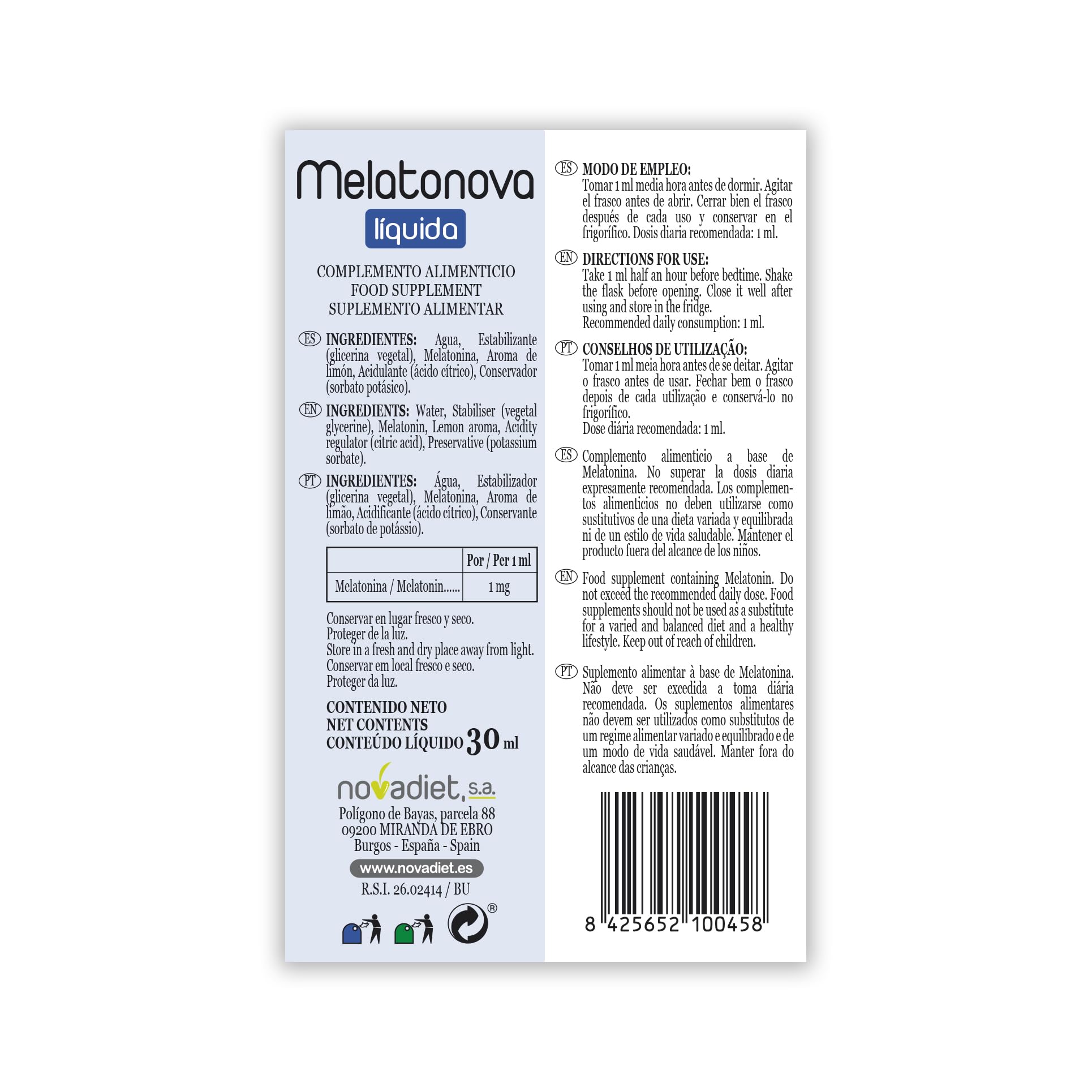 Detalles: Descripción Descripción del producto Melatonova Líquida Novadiet 30 ml Ingredientes Consultar envase