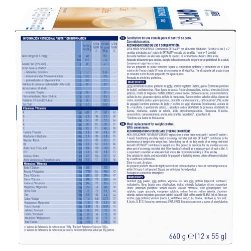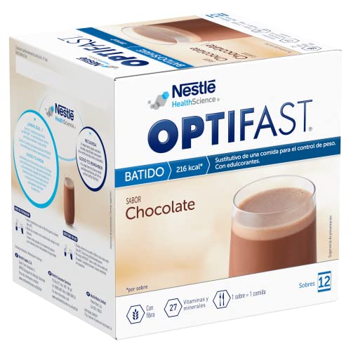 Detalles: Descripción del producto El batido sabor chocolate de Optifast es un sustitutivo de una comida para el control de peso. Una forma segura y eficaz para el control de peso. Composición diseñada para cubrir las necesidades diarias en proteínas, hidratos de carbono, grasas, minerales y vitaminas. Puede administrarse tanto como dieta exclusiva (4 sobres/día) o como dieta mixta hipocalórica combinada con alimentos habituales. 1 sobre = 1 comida Indicaciones CANTIDAD RECOMENDADA: Como dieta mixta hipocalórica: combinando Optifast con alimentos habituales. Sustituya al día una o dos comidas principales por 1 sobre en cada una de ellas (1 sobre = 1 comida); Como dieta de mantenimiento: sustituir una de las comidas principales por un Optifast de 3 a 4 días a la semana. Como dieta exclusiva: sustituir todas las comidas del día por Optifast (4 sobres/día). Se recomienda utilizar Optifast bajo la supervisión de un profesional sanitario, especialmente cuando se usa como dieta exclusiva durante más de tres semanas. Ingredientes Proteína de leche, fibra (inulina), fructosa, jarabe de glucosa, cacao en polvo (contiene lecitina de soja), sacarosa, aceites vegetales (girasol), (contiene proteínas de leche) y niabina (contiene proteínas de leche)), minerales (citrato potásico, carbonato de magnesio, fosfato potásico, cloruro sódico, fosfato cálcico, pirofosfato férrico, sulfato de zinc, gluconato cúprico, sulfato de manganeso, fluoruro sódico, cloruro de cromo, yoduro potásico, selenito sódico y molibdato sódico), aceite MCT, aroma, aceite de pescado (contiene protenias de leche, lecitina de soja), emulgente (lecitina de soja), edulcorantes (acesulamo K y aspartamo*) y vitaminas (nicotinamida, acetato de DL-αtocoferilo, D-pantotenato cálcico, ácido ascórbico, clorhidrato de piridoxima, clorhidrato de tiamina, riboflavina, acetato de retinilo, ácido pteroilmonoglutámico, fliquinona, D-biotina, colecalciferol y cianocobalamina). * Contiene aspartamo (una fuente de fenilanina). dirección PREPARACIÓN: Preparar el batido sabor de Optifast es muy fácil y se puede tomar frío: verter el contenido de un sobre en 1 bol de 200ml de agua. Mezclar con un tenedor o con una coctelera hasta conseguir su total disolución. Dejar reposar (preferiblemente en nevera) durante 3 minutos. Contenido de la caja OPTIFAST Batido