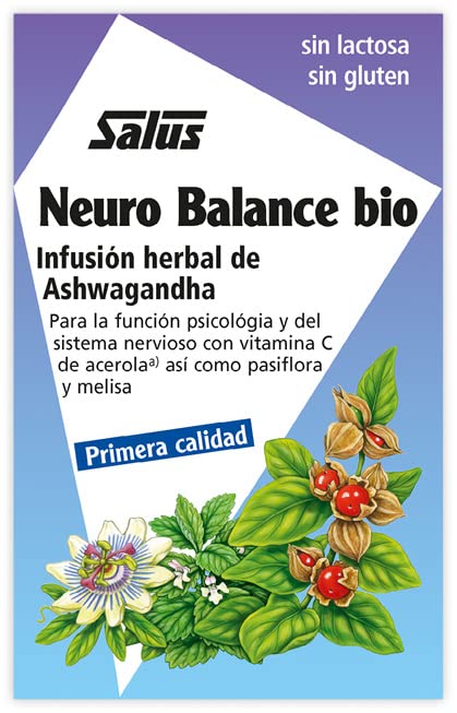 Detalles: Descripción Descripción del producto Salus - Neuro Balance - Contribuye al Buen Funcionamiento del Sistema Nervioso - 15 sobres Nuestro Neuro Balance es el complemento alimenticio perfecto para preservar tu equilibrio interno. Gracias a sus propiedades, estas infusiones te ayudan a mantener los niveles de energía en caso de debilidad, estrés y falta de concentración, contribuyen a conciliar el sueño y a una función psicológica normal. Está elaborado a base de raíz de ashwagandha, fruto de manzano, hierba de pasiflora, hojas de melisa, escaramujo, aronia, hojas de eucalipto, cáscara de naranja dulce, polvo de frutos de acerola, hojas de menta, corteza de canela, extracto de algarroba, aromas naturales y vitamina C. No contiene gluten, lactosa ni fructosa. Modo de empleo: - Colocar la bolsita en una taza y verter aproximadamente 200 ml de agua hirviendo. - Dejar en reposo durante unos 7 minutos y después retirarla. Está contraindicado durante el embarazo, la lactancia y para los niños. Apto para vegetarianos y veganos. Los complementos alimenticios no deben usarse como sustituto de una alimentación variada y equilibrada. SOBRE NOSOTROS: En Salus cuidamos de tu salud y la de los tuyos desde hace más de 100 años, siempre con un toque holístico y siguiendo los principios de nuestro fundador. Uno de nuestros principales objetivos es hacer un uso responsable de los recursos naturales, por eso realizamos una cuidadosa y esmerada selección de materias primas. Ingredientes Raíz de ashwagandha* (20 %), fruto de manzano*, hierba de pasiflora* (10 %), hojas de melisa* (10 %), escaramujo*, aronia*, hojas de eucalipto*, cáscara de naranja dulce*, polvo de frutos de acerola* (5 %), hojas de menta*, corteza de canela*. *procedente de agricultura ecologica Inherentemente libre de gluten.