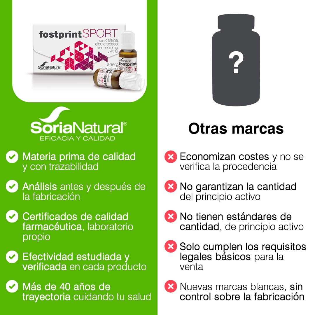 Detalles: Descripción del producto FOST PRINT SPORT 20vial SORIA NATURAL. La marca Soria Natural garantiza el respeto de los mas altos estandares durante el proceso de produccion, con el fin de asegurar una excelente experiencia al cliente. Ingredientes Capsula: Maltodextrinas, antiaglomerante: dioxido de silicio, nicotinamida (niacina), D-pantotenato calcico (acido pantoténico), extracto seco de propoleo (Propolis, resina)(6 mg), piridoxal 5-fosfato (Vit. B6), colecalciferol (Vit. D), clorhidrato de tiamina (Vit. B1), estabilizante: carboximetilcelulosa sodica reticulada, nicotinamida adenin dinucleotido (NADH), D-biotina. Vial: Agua, glucosa, humectante: glicerina, fructosa, jalea real liofilizada, bisglicinato ferroso, Acido L-ascorbico (Vit. C), corrector de acidez: acido citrico, cafeina, aromas, L-carnitina Tartrato, gluconato de manganeso, extracto seco de eleuterococo (Eleutherococcus senticosus (Rupr. et Maxim.) Maxim, raiz) (11,2 mg), conservador: sorbato potasico, edulcorante: glucosidos de esteviol, riboflavina (Vit. B2), picolinato de cromo. dirección Tomar un vial al día, directamente o diluido en un vaso de agua o zumo de frutas e ingerir inmediatamente. Los deportistas en fase de competición pueden tomarlo según sus necesidades, 20-30 minutos antes y durante la competición o entrenamiento duro. Advertencia de seguridad No utilizar como sustituto de una dieta variada y equilibrada y un estilo de vida saludable. No superar la dosis expresamente recomendada.