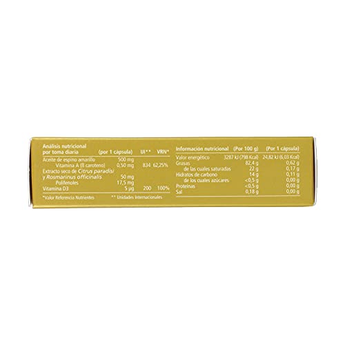 Detalles: Descripción del producto OlioVita Protect® es una combinación a base de extractos exclusivos 100% naturales con acción sinérgica: aceite de espino amarillo, extracto de pomelo y romero, y vitamina D, con propiedades hidratantes y antioxidantes. Con propiedades hidratantes y antioxidantes, actúa nutriendo, protegiendo y reparando la piel de los efectos nocivos de los rayos solares, sin bloquear el bronceado natural de la piel. Ingredientes Aceite de espino amarillo (Hippophae rhamnoides), cápsula (gelatina de PESCADO, humectante (glicerina vegetal), agua, colorante (óxido de hierro rojo)), extracto de pomelo (Citrus paradisi) y romero (Rosmarinus ofcinalis), espesante (cera de abeja), vitamina D3 (colecalciferol). dirección Modo de empleo: Tomar 1 cápsula al día. Advertencia de seguridad OlioVita Protect es un complemento alimenticio. Almacenar en un lugar fresco y seco. Mantener fuera del alcance de los niños más pequeños. No superar la dosis diaria expresamente recomendada. Los complementos alimenticios no son sustitutos de una dieta equilibrada. Se recomienda tener una dieta equilibrada y variada y un estilo de vida saludable. Consultar con su médico o farmacéutico antes de empezar la suplementación en caso de embarazo, si toma algún medicamento o si sufre alguna enfermedad.