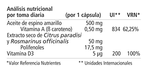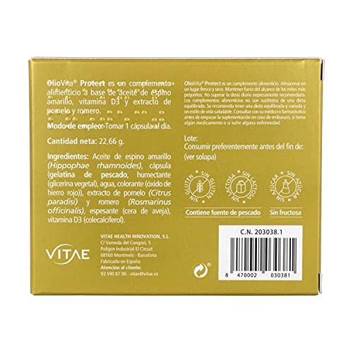 Vitae OlioVita Protect fotoprotector oral con aceite de espino amarillo, extracto de pomelo y romero, y vitamina D - 30 cápsulas